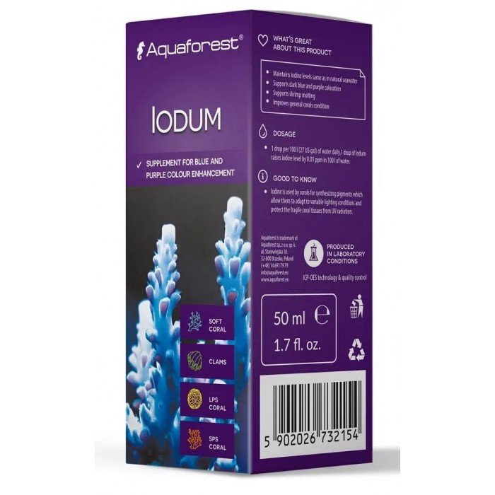 Aquaforest Iodum is used for synthesising corals. This also helps with pigments and can intensify blue and purple coloration.