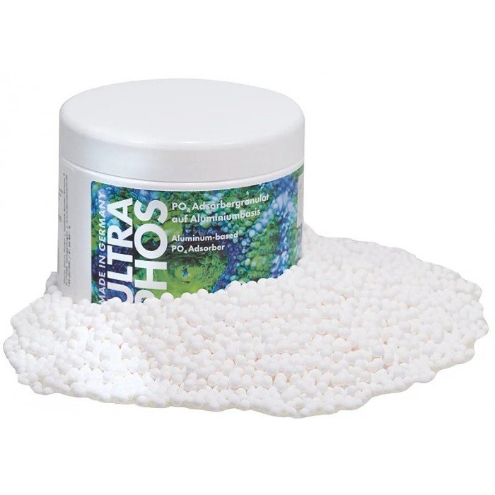 Ultra-Phos is an aluminium-based adsorber granules that safely removes phosphates, humic acids and organic pollutants. These pollutants are firmly bound to the surface of the ultra phos and not released again. With ultra phos, the nutrient content of the aquarium can be kept very low. Undesirable algae growth is effectively prevented and corals can develop their natural colours. Use and dosage: please always make changes to the aquarium carefully. Use 50g per 200 litres of water at the beginning. After 14 days, you can increase the amount to 100 g per 200 litres of water. Check the PO4 content regularly, e.g. with our FaunaMarin PO4 test. When the PO4 content rises again, replace Ultra-Phos for fresh material. Do not use more than 100 g per 200 litres of water. We recommend placing the material in a well-drained filter chamber, where it unfolds its best effect. At extremely low PO4 and undetectable NO3 values, no ultra phos should be used. Ultra-Phos is very strong and is used in nutrient-rich basins. Since Ultra-Phos removes unwanted organic compounds and dyes, it may take some time to achieve a measurable PO4 reduction at a high percentage of these substances. This is normal and you will notice this by the yellowing of the material and the much clearer water. When using in vertebral bed filters, make sure that the performance of the material is significantly increased. In this case, reduce the amount by 50% and pay attention to the flow-flow in the filter. The material can heat up in water, does not need to be washed out. Keep product away from children. Do not use for animals that are used to extract food. Do not inhale, do not swallow. Avoid contact with skin and eyes.