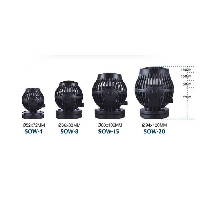 SOW-4 SOW4 is ideally suited for nano-reef aquariums with adjustable flow rates from 500 to 4000L/H SOW-8 SOW8 is ideally suited for nano-reef aquariums with adjustable flow rates from 700 to 8500/H SOW-15 SOW4 is ideally suited for nano-reef aquariums with adjustable flow rates from 1200 to15000L/H