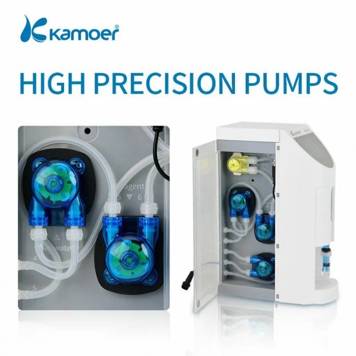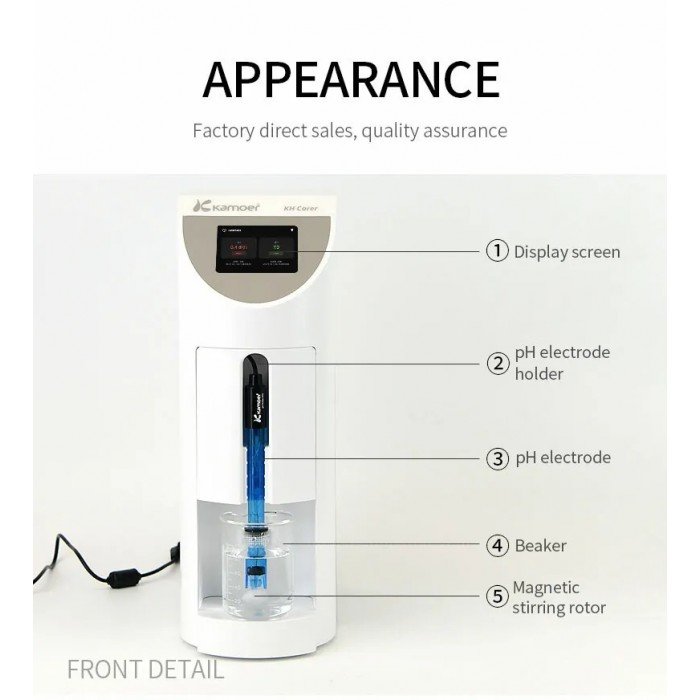 The Kamoer KH Carer is an automatic testing device measuring KH values (Alkalinity) in an aquarium. It includes manual and automatic detection functions. Users can easily view the test results and set the test parameters in the Android or iOS app. The equipment can adjust the KH value according to the test results automatically.